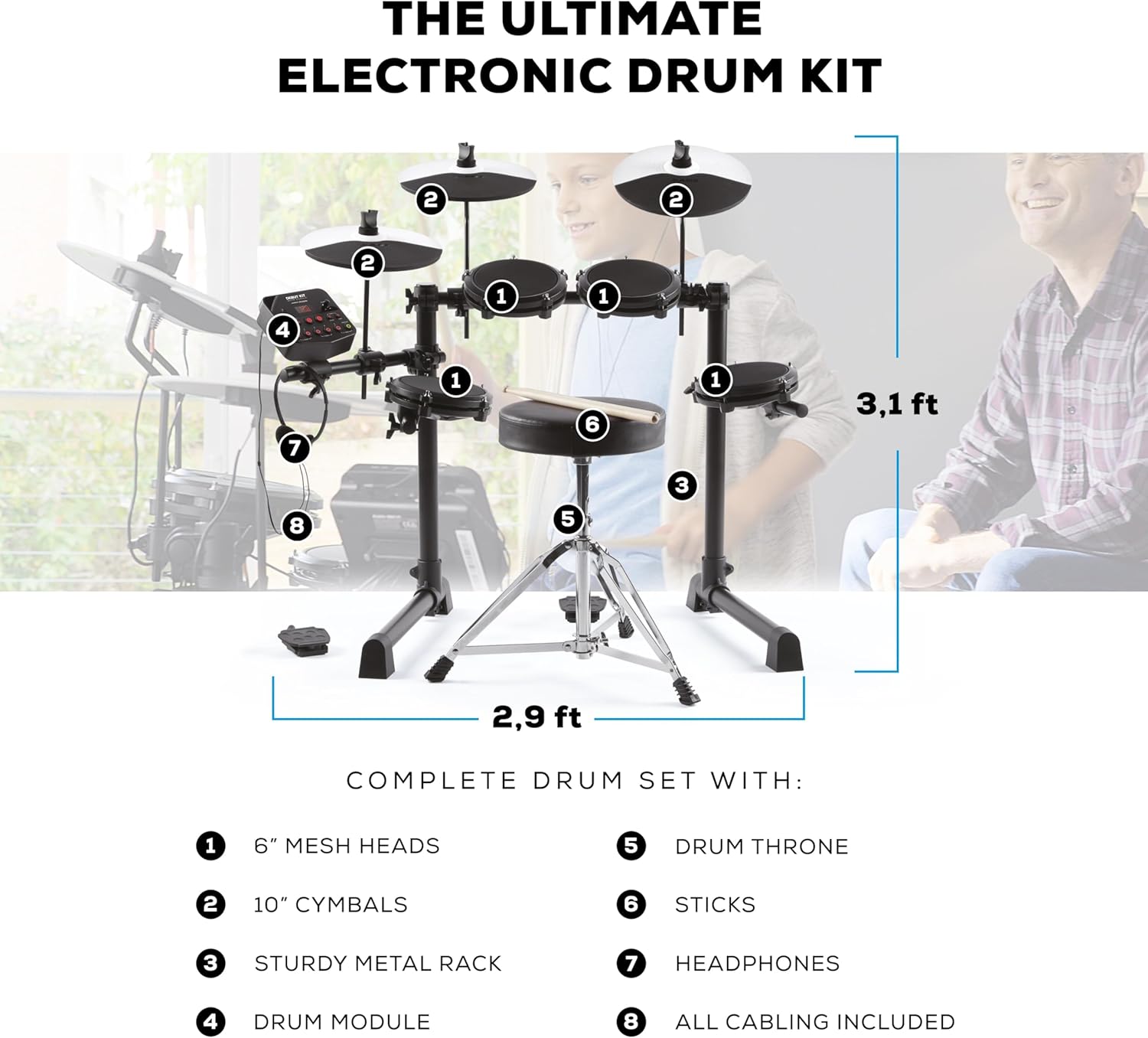 - Complete Electronic Drum Kit – Drum set with mesh electric drum kit heads, three cymbals, sturdy metal rack, drum module, drum throne, sticks, headphones and all cabling