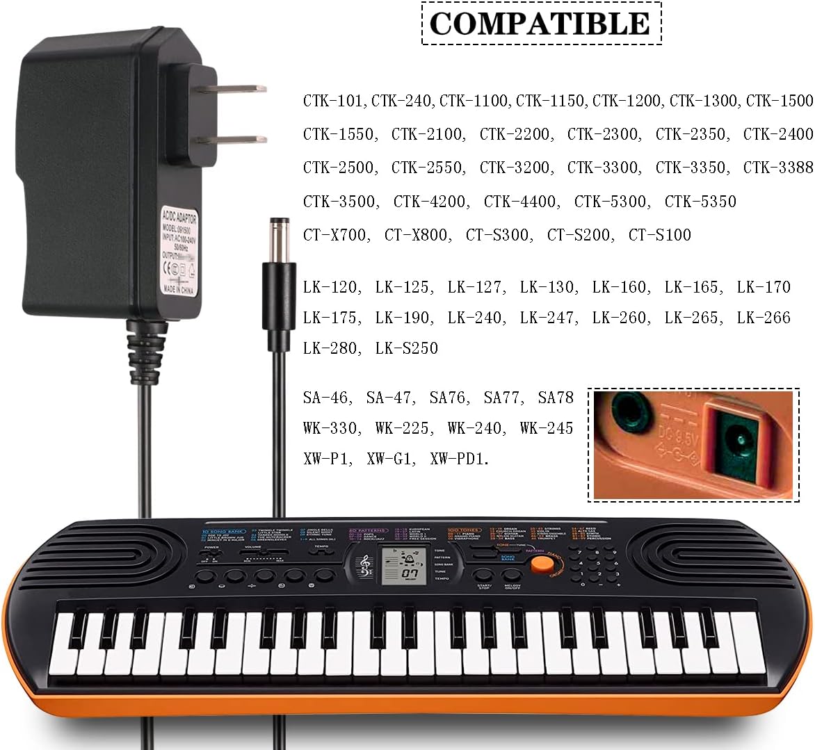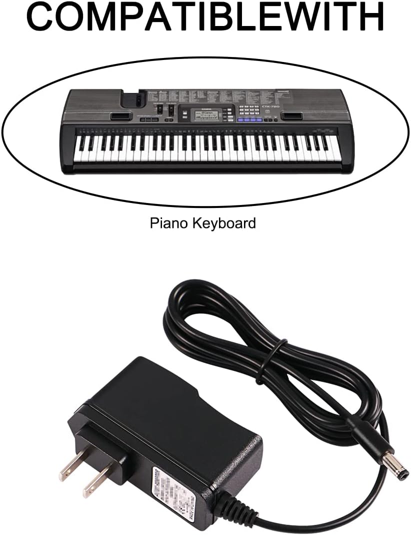 Casio 9.5V 1A AC/DC Power Supply Adapter for Casio Piano Keyboard ADE95100LU/B SA-46 SA-47 SA76 SA-77 SA-78 CTK-2080 CTK-2550 CTK-3200 CTK-3500 LK-265 LK-280 CT-X700 CT-X800 CT-S300 Charger Cable (6 FT)