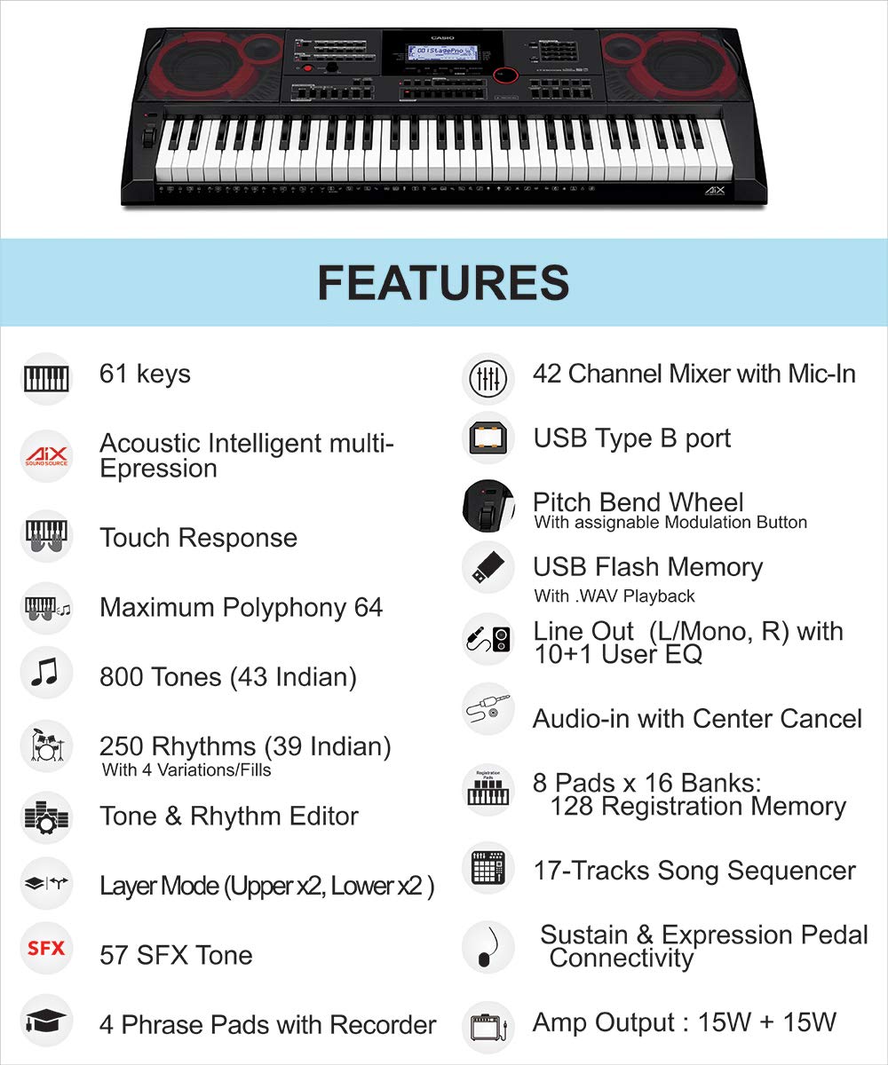 CT-X9000IN, is equipped with 43 Indian tones and 39 Indian rhythms. Authentic Indian ensemble sounds like Sitar, Tabla, Harmonium, Santur, Sarangi and various regional rhythms makes this keyboard the ultimate Indian keyboard. The keyboard also comes with 57 SFX sounds which makes it ideal for Indian performers.